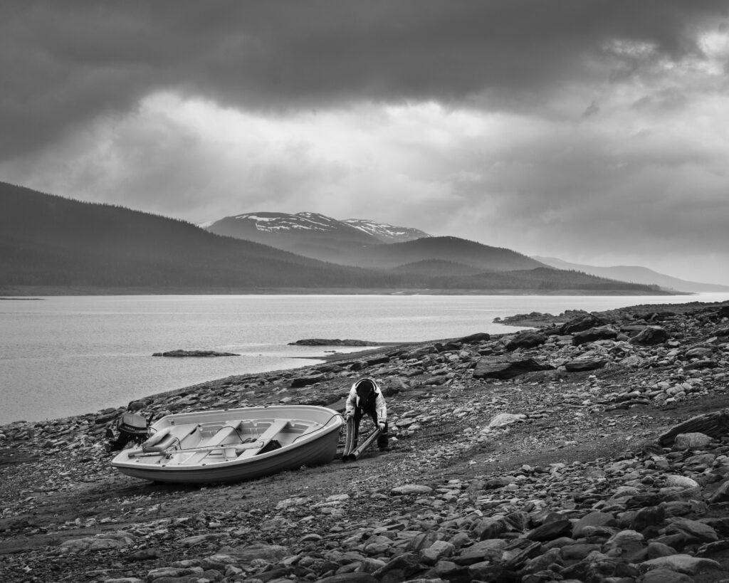 Mikael Sandberg förbereder en fisketur på våren när vattnet står som lägst i Gardiken, ett av Umeälvens kraftverksmagasin.